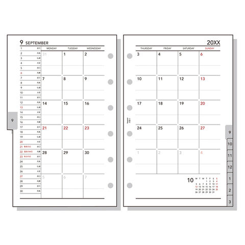 見開き両面1ヶ月ブロック式・月曜始まり・インデックス付。見たい月をすぐに探せるインデックス付き。 16ヶ月分、