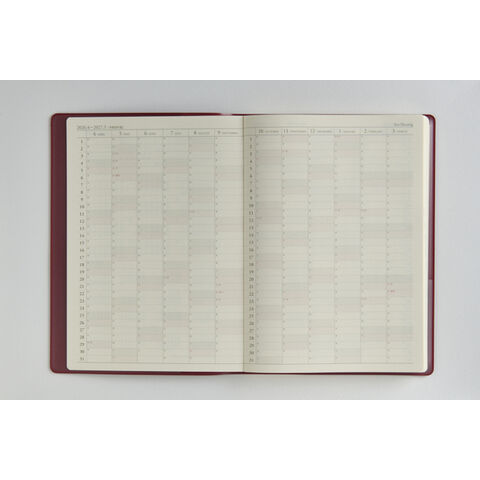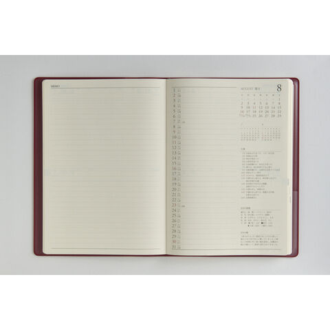 高級感があってお洒落なエンジ色のカバー。1頁2日の記入形式はたくさん書きたい方におススメのロングセラー商品です。。毎月の月扉では、年中行事や季節の役立つ情報も掲載しています。
