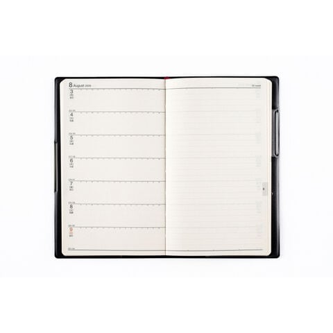 【月間予定表】ベーシックで見やすいブロック式。各日の中央に罫線が入っていて、午前午後のように予定を分けて書くこともできます。 【週間予定表】左ページにスケジュール、右ページに罫線メモが付いているレフト式。仕事のメモや日記など、自由な使い方ができます。