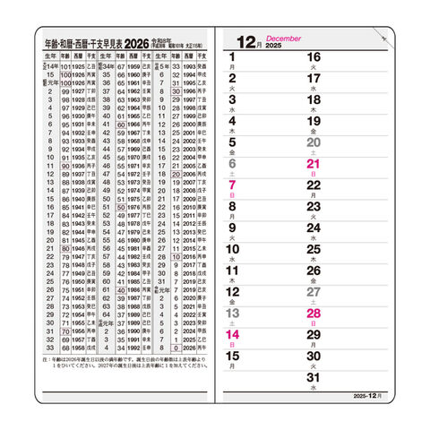 厚さ2ミリのコンパクトな見開き1ヶ月ダイアリー手帳です。仕様:中ミシンとじ 内容:月間ダイアリー、ノート、カレンダー、年齢早見表、持主メモ