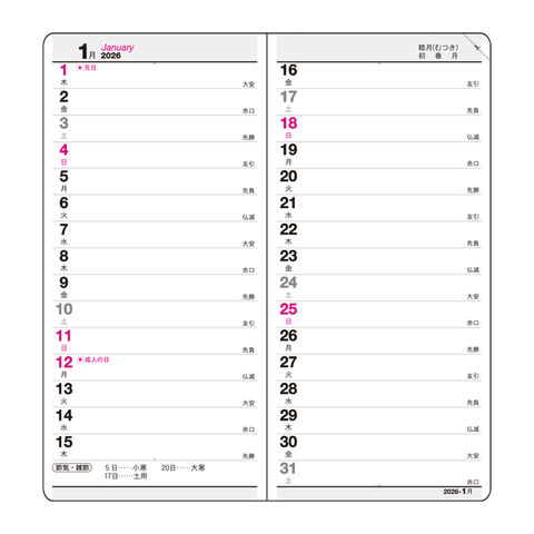 コレクト 2026年 手帳・ダイアリー プログラム 紙幣サイズ 1ヶ月横罫