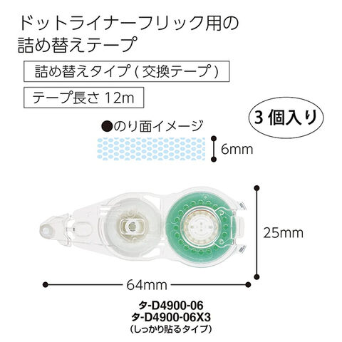 【1000円以上お買い上げで送料無料♪】コクヨ テープのり ドットライナーフリック つめ替え用テープ 3個パック 6mm幅 12m巻 強粘着 コンパクト - メール便発送