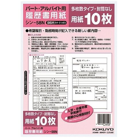【1000円以上お買い上げで送料無料♪】コクヨ 履歴書用紙(多枚数) 【パート・アルバイト用】B5 10枚 シン-58N - メール便発送