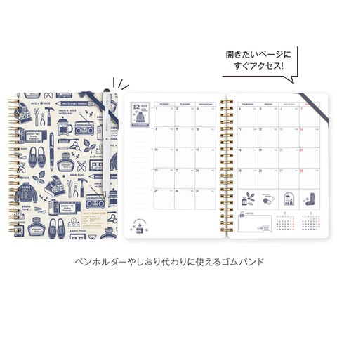 表紙、マンスリー、ノートページと細部までericの世界観を表現しました。表紙デザインのアクセントになっているゴムバンドはペンホルダーやしおり代わりにも。
