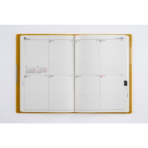 【月間予定表】カレンダーのような感覚で使え、週ごとの予定が把握しやすいブロック式。左端にはメモスペース、右下には前次月のカレンダーが付いています。 【週間予定表】見開き1ページで1週間分のスケジュールを管理。1日ごとの記入スペースが広くて自由に使いやすく、ライフログやイラストなども書き込めます。ビジネスユースのほか生活の記録や日記帳として使いたい方にもおすすめです。