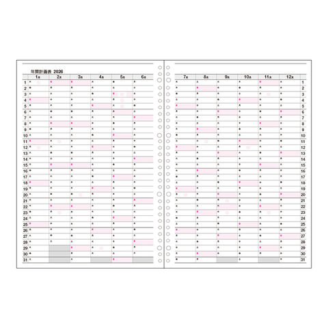 リングバインダーのリフィルとして使えるブロックタイプの見開き1ヶ月ダイアリーです。仕様:30穴日記リーフ 内容:年間計画表、プランニングテーブル、LIFE PLAN、月間ダイアリー、統計、ノート、アドレス、資料編
