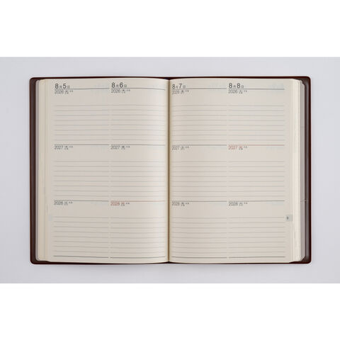 3年分の記録を書き込める連用ダイアリー。横ケイ式の月間ページは3年分の予定が一覧でき、ビジネスや年間行事などの管理に役立つ一冊です。シックなブラウンのカバーは、ビジネスにもプライベートにも。