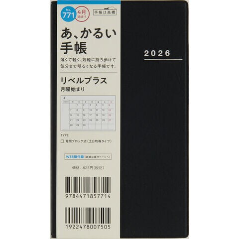 【送料無料】高橋書店 2026年 手帳・ダイアリー 3月始まり 【771】リベルプラス 手帳判 見開き1か月 ミッドナイト・ブラック - メール便発送