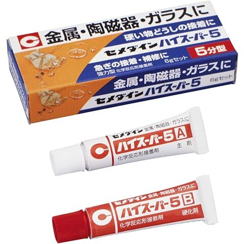 急ぎの接着・補修作業に最適。5分で硬化し始めるスピードタイプの接着剤です。硬化膜が硬く、強靭なので、金属や陶磁器、ガラスなどの硬いもの同士をカッチリ堅く接着。化学反応により硬化するので、肉やせが少なく、穴埋めや隙間充填などの応用も可能です。●容量:6gセット●2液混合型●硬化速度:5分型●強力型●主成分:エポキシ樹脂系●容器形状:チューブ●商品呼称:ハイスーパー5●包装形態:紙箱入