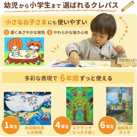 ・クレパスはやわらかくて伸びが良いため面塗りに適しています。発色としては不透明で油絵のような重厚なタッチの絵が描けます。混色・重色・ぼかし・盛り上げ・ひっかき等様々な技法が使え、幼稚園から専門家まで広く使われています。