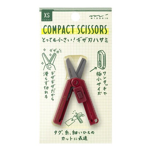 【1000円以上お買い上げで送料無料♪】XS コンパクトハサミ ギザ刃 えんじ ロック機能付 のりがつきにくい 極小 コンパクト 持ち運び 携帯 ミドリ - メール便発送