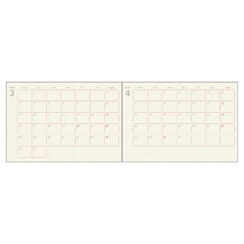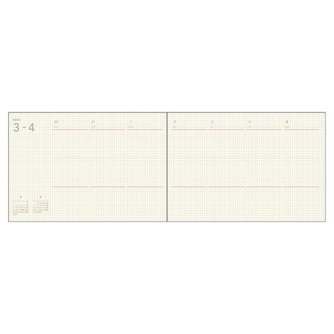 見開きの年間カレンダーは月ごとにメモ欄があり、バースデーやイベントを書き込むのに便利です。カレンダーとして使えるミニサイズマンスリーは予定や締め切りの日をマークしたり、体重などの日々の記録にもおすすめです。ざっくりと予定が書けるフリーバーチカルはAM・PM・メモや、仕事・プライベート・メモ、朝・昼・夜など3段で自由に活用できます。2.5mm方眼なのでメモページや余白にも図や線が書き込みやすい仕様になっています。