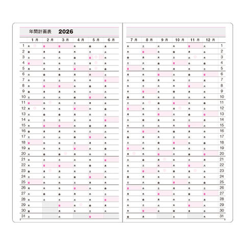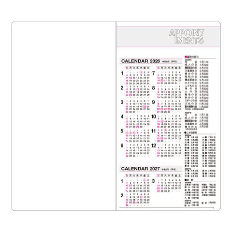 独特のスタイルが好評の見開き1ヶ月ダイアリーです。仕様:塩ビ製差込表紙、中ミシンとじ 内容:年間計画表、月間ダイアリー、ノート、アドレス、資料編