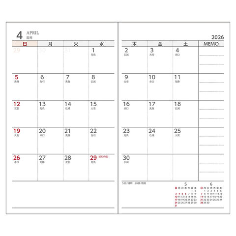 1ヶ月の予定を曜日ごとに把握しやすい、カレンダーと同じ感覚で使える月間予定表です。簡単に予定を管理したい方におすすめです。薄くて軽いので持ち運びにも便利です。