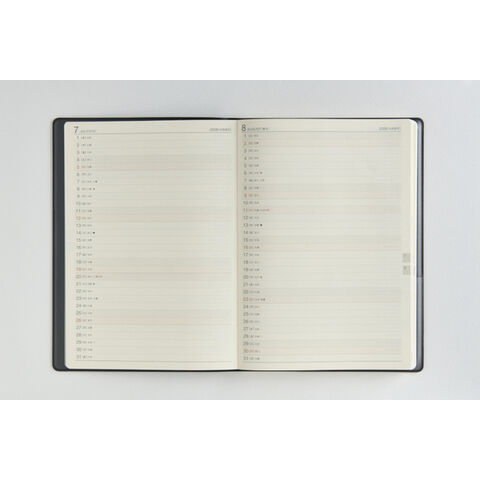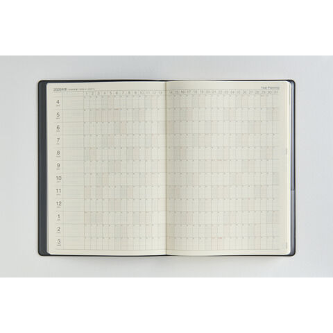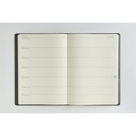 【月間予定表】1ヵ月1ページで長期予定も管理しやすい横罫式。週ごとに区切りケイが入っているので、1週ごとの予定も見やすいです。 【週間予定表】左にスケジュール、右に横罫メモが付いているレフト式。スケジュール欄は時間目盛り付きで、月曜から金曜までの記入スペースが広い平日重視型。右ページのメモは、罫線が日ごとに区切られているので、左の予定と連動した記入も可能。