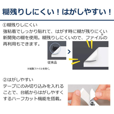 強粘着でしっかり貼れて、はがす時に糊が残りにくい新開発の糊を使用。糊残りしにくいので、ファイルの再利用もできます。