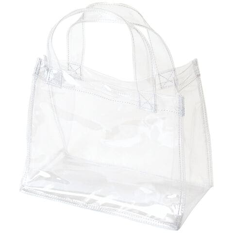 ステッチ加工があり、丈夫で繰り返し使えます。持ち手の長さ280mm。●ショッピングバッグ●サイズ:縦200×横250×マチ135mm●材質:塩化ビニール●厚:0.3mm