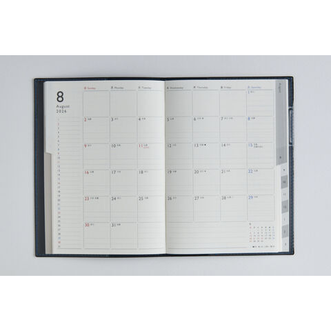 【月間予定表】月間ページは、カレンダーと同じ感覚で見ることができ、週ごとの予定が把握しやすい日曜始まりのブロック式。 【その他】各月の後ろに横罫メモと方眼メモが2ページずつ付いているので、月間ページに書ききれなくても安心。