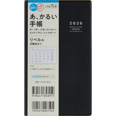 【送料無料】高橋書店 2026年 手帳・ダイアリー 3月始まり 【891】リベル 手帳判 見開き1か月 ミッドナイト・ブラック - メール便発送