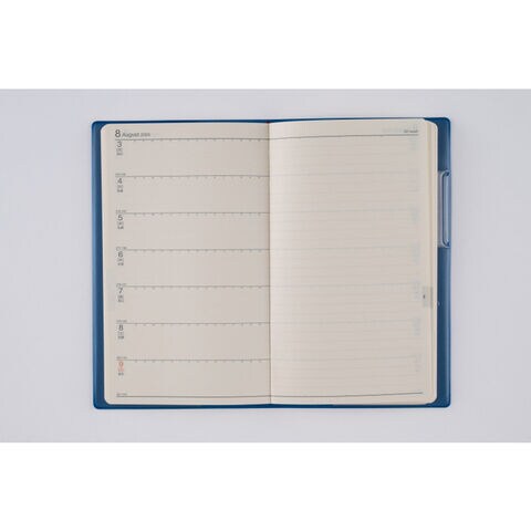 【月間予定表】ベーシックで見やすいブロック式。各日の中央に罫線が入っていて、午前午後のように予定を分けて書くこともできます。 【週間予定表】左ページにスケジュール、右ページに罫線メモが付いているレフト式。仕事のメモや日記など、自由な使い方ができます。