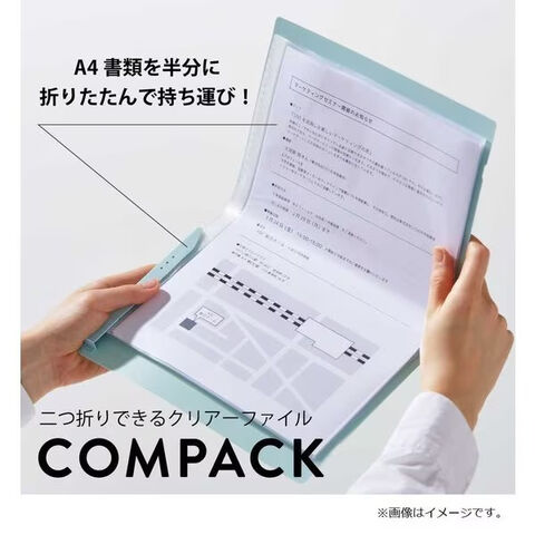 A4書類を1/2サイズに折りたたんでコンパクトに持ち運べる、携帯性抜群のクリアーファイルです。ファイルや書類のために大きなカバンを用意せずとも、スマートに持ち運びが可能。ゴムバンド付きなのでしっかりと閉じたまま携帯できます。