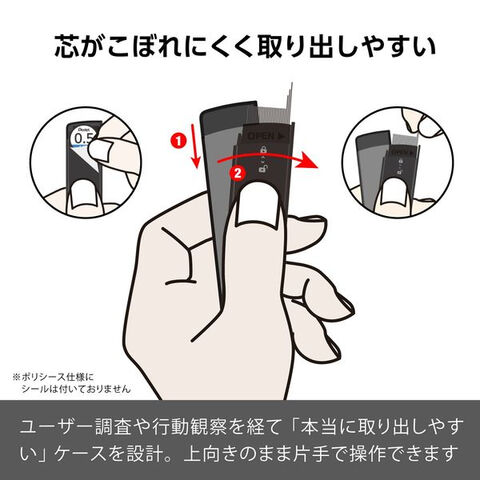 スライドさせるだけでケースを上向きのまま操作できるから、芯をこぼすリスクを減らせます。