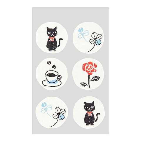 クローバー、くろねこ、コーヒー、バラの4つのラッキーモチーフをあしらった封かんシール付。