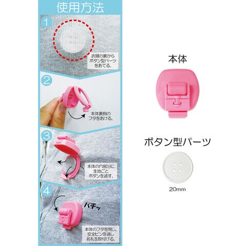 衣類に穴をあけずに名札を留められる「なふだっこ」です。