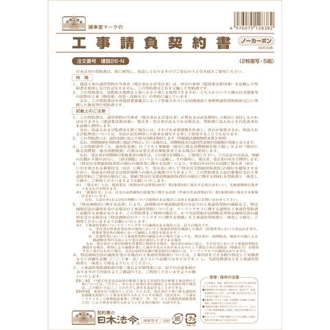 【1000円以上お買い上げで送料無料♪】日本法令 工事請負契約書 建設26-N ノーカーボン 2枚複写 請負金額 - メール便発送