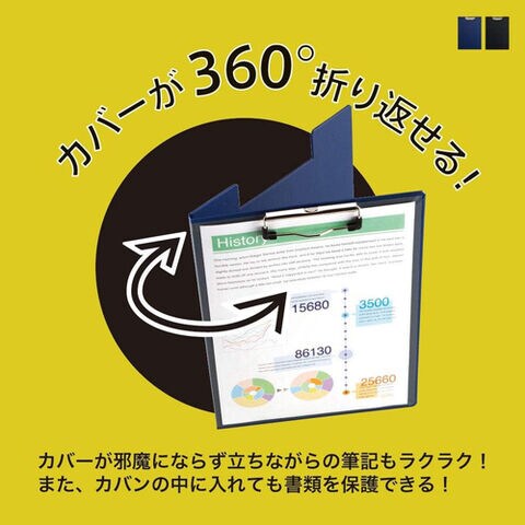 従来のクリップボードと異なり、カバーが360°折り返せるので邪魔にならず省スペース。