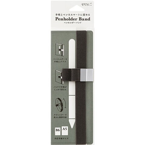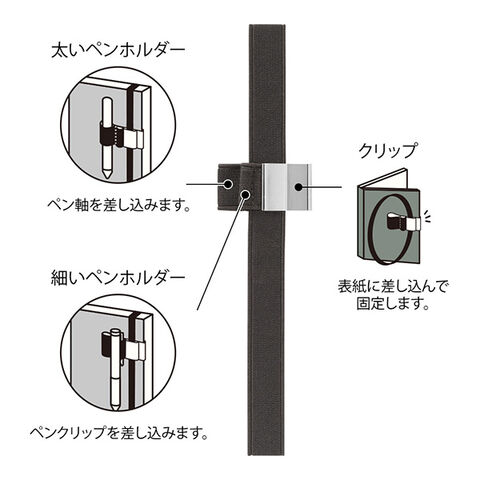 ペンホルダーバンド B6~A5用 黒 ゴムバンド 金属クリップ ペン差し アジャスター調節 手帳 ノート ミドリ