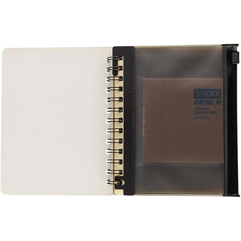 リングに上部の爪を引っ掛け、下部の穴をリングにセットして固定します。簡単に着脱できるので、セットするページ位置は自由に変更可能。冊子を閉じた状態だとページの右端からスライダーの開閉部分が見えるので、ブックマークのように使うこともできます。Mサイズのほか、L、A5もあります。