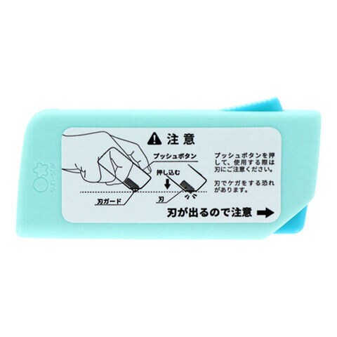 プッシュボタンを押すと、刃ガードのロックが外れ、ダンボールに押し込むことで刃が出てきて切ることができます。