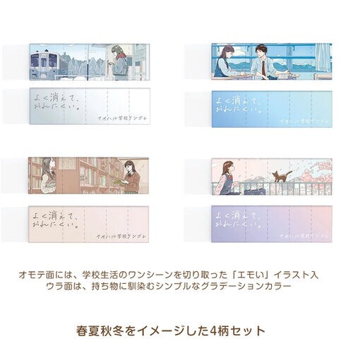 【4柄セット】 アオハル 学校ケシゴム 消しゴム スリム 青春 春夏秋冬 エモい イラスト ミシン目入スリーブ かわいい クツワ
