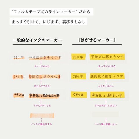 従来のインク式ラインマーカーにありがちな、インク汚れや色むら、裏移り、文字のにじみなどがありません。