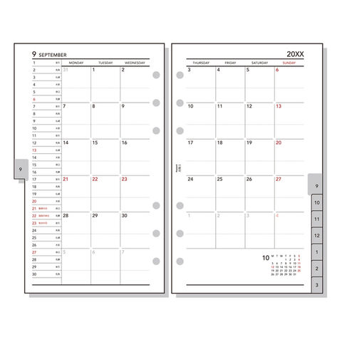 見開き両面1ヶ月ブロック式インデックス付き 月曜始まり。見たい月をすぐに探せるインデックス付き。 16ヶ月分、