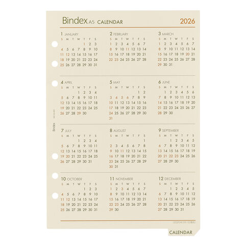 【1000円以上お買い上げで送料無料♪】Bindex バインデックス 2026年 システム手帳 リフィル A5サイズ 年間カレンダー 3年間タイプ - メール便発送