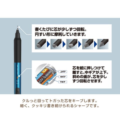 秘密は、芯を保持したギアが筆圧で上下しながら回りる「クルトガエンジン」。