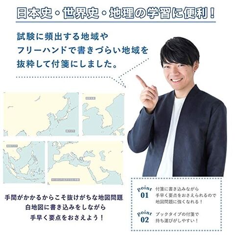 地図付箋は日本史や世界史、地理の学習に使える付箋。フリーハンドでは書きづらく時間がかかる地図作成。そんな時間を有効に使えるのが地図付箋。試験に頻出する地域を抜粋しています。白地図に書き込みをしながら要点をおさえることが出来ます。付箋になっているのもポイント。ルーズリーフやノート等に貼り付けて学習の手助けとなります。