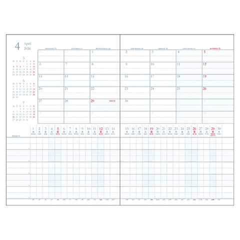 1ヶ月の予定(月間ブロック)を見ながらプロジェクトの進捗管理ができます。同じページで月間ブロックとチャートを並べて見ることができるので、短期スケジュールにおススメのレイアウトです。チャート部分には5つのプロジェクト枠があり2行に分かれているので、午前・午後や自社・外注先のように項目を分けて書くのはもちろん、10プロジェクト分として記録することもできます。また、お使いの手帳カバーに差し込んで別冊の手帳としてもお使い頂けるよう、通常の規格サイズより少し小さめサイズになっています。
