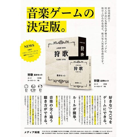 『狩歌(かるうた)』は、実際に任意のJPOP曲を流しながら、歌詞中の「君」「きっと」「世界」などのよく出てきそうな単語カードをカルタ取りして集めるゲームです。