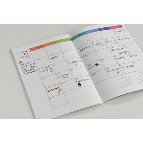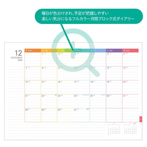 1ヶ月の予定(縦軸)曜日ごとに把握しやすく、楽しい気分になる人気のフルカラー月間ブロックダイアリー。