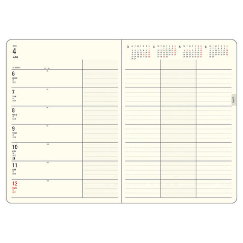 週間ページは自分で項目を決めて、予定を分けて管理できるレイアウトです。家族の予定を書いたり、案件ごとに分けて管理するビジネス手帳として、また習い事や習慣を記録するのにもおすすめです。