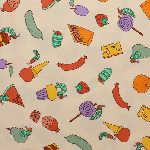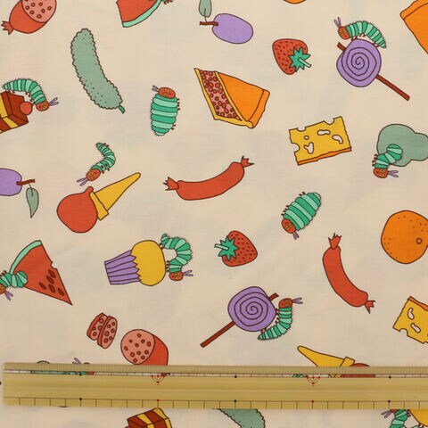 大人気の絵本「はらぺこあおむし」デザインのオックス生地です。入園・入学用品の手作りに最適です。例えば、ランチョンマット、レッスンバック、お弁当袋、給食袋、コップ袋、シューズケース、体操着入れ、マスクなどの手作り素材におすすめです。