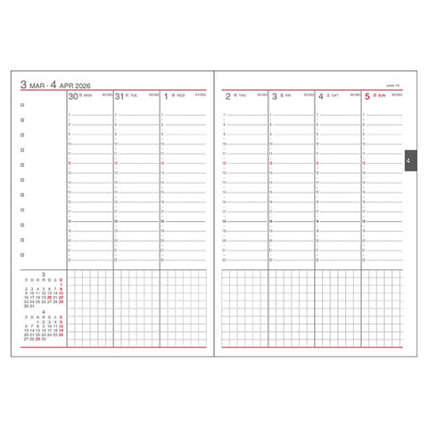 縦に時間ごとの目盛りが用意されたバーチカルレイアウトです。時間を区切って管理しやすいのが特徴。営業職など1日に時間単位で複数の予定が入る方、隙間時間を見つけて効率をあげたい、細かく時間管理をしたい方などにおすすめです。