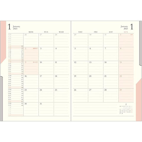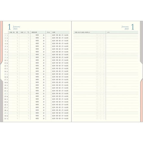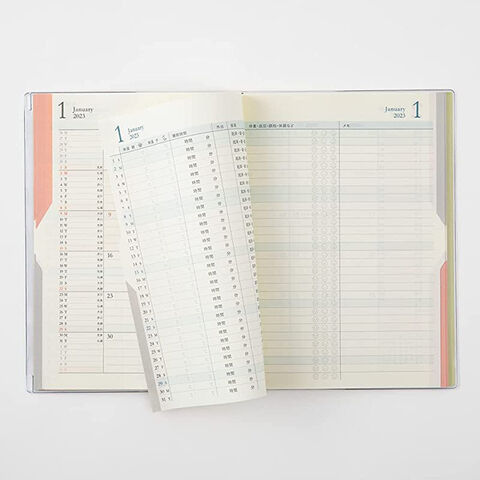 予定と、体温や体調や服薬記録、外出記録を簡単に記入できる手帳です。自己管理の意識、体調管理の大切さが再認識されている中、スケジュールと、日々の体調を合わせて管理できるダイアリーとして誕生しました。月間ブロックタイプのスケジュールページと、同じ月の毎日の体調を把握できる体調管理ページを、それぞれ見開きで設けています。赤のインデックスを押さえるとスケジュールページのみが、グレーのインデックスを押さえると体調管理ページのみが開き、また、赤とグレーの間にある白のインデックスを押さえるとスケジュールと体調管理ページが交互に開く仕組みです。必要なページのみをすぐに検索できます。持ち運びやすいコンパクトなB6サイズです。ビジネスシーンで役立つ六曜入り。本文に使われている「MD用紙」はにじみや裏抜けがしにくく、書き味の良さを追求し続けているオリジナルの筆記用紙です。