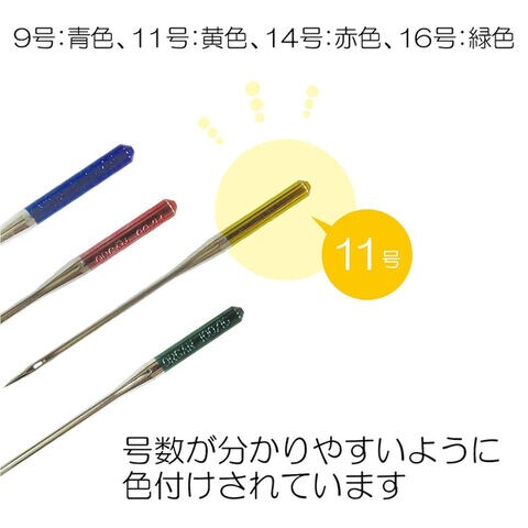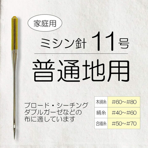 家庭用ミシンに♪安心品質のオルガン針社の「ミシン針」です。「11号」は、普通地(ブロード・シーチング・ダブルガーゼなど)の生地を縫う際にご使用ください。縫い糸は、木綿糸#60~#80、絹糸#40~#60、合繊糸#50~#70をご使用ください。サンコッコーの家庭用ミシン針は、針の号数が分かりやすいように、色付けをしています。【サイズ】約φ2.02×針穴までの長さ33.80mm【材 質】鋼【入 数】5本【生産国】ベトナム【ご注意】※幼児の手の届かないところに保管してください。