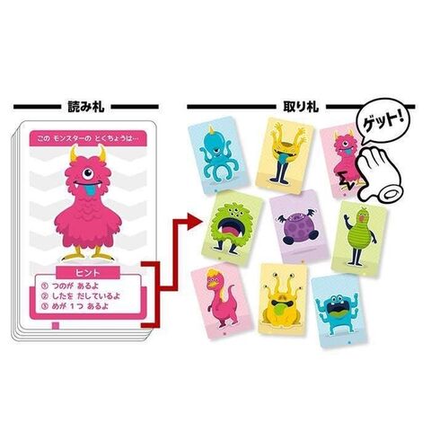 読み手は読み札のモンスターの特徴【色や形など】を取り手に伝えます。