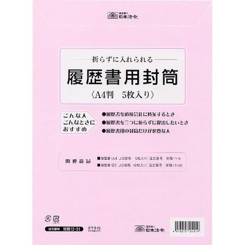 【1000円以上お買い上げで送料無料♪】日本法令 労務 12-31 履歴書用封筒 A4サイズ - メール便発送