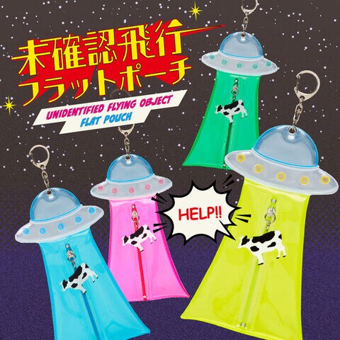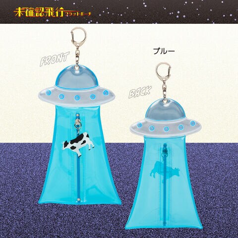 未確認飛行 フラットポーチ ブルー キーホルダー UFO 牛 リフレクター 小物入れ 推し活 面白グッズ サンスター文具